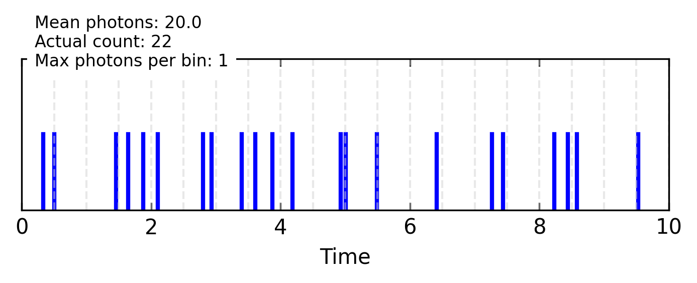 # Generate a random photon streamnp.random.seed(42) # For reproducibilitytotal_time =10# Total observation time Tnum_bins =200# Increased number of time bins M to ensure at most 1 photon per bindt = total_time / num_bins # Width of each time bin# Average photon rate (mean photons per unit time)photon_rate =2# Reduced alpha in the notes to ensure fewer photonsmean_photons = photon_rate * total_time # Total mean photon number over time Tmu = mean_photons / num_bins # Probability of photon per bin# Generate random photons based on probability mu for each bin# Ensuring at most one photon per binphoton_events = np.random.random(num_bins) < mu# Generate random positions within each bin for the photonsphoton_times = []for bin_idx in np.where(photon_events)[0]:# Place photon randomly within its bin, not at the edge rand_position = bin_idx * dt + np.random.random() * dt photon_times.append(rand_position)photon_times = np.array(photon_times)# Verify no bin has more than one photonbin_counts = np.histogram(photon_times, bins=num_bins, range=(0, total_time))[0]max_photons_per_bin = np.max(bin_counts)# Create the figurefig, ax = plt.subplots(figsize=get_size(12, 5))# Plot vertical lines for each photonfor t in photon_times: ax.plot([t, t], [0, 1], 'b-', linewidth=2)# Add grid lines to show time binsfor i inrange(num_bins +1):if i %10==0: # Only show every 10th grid line to avoid clutter ax.axvline(i * dt, color='lightgray', linestyle='--', alpha=0.5)# Set axis limits and labelsax.set_xlim(0, total_time)ax.set_ylim(0, 2)ax.set_yticks([])ax.set_xlabel('Time')# Add text showing statisticsactual_count =len(photon_times)ax.text(0.02, 0.95,f"Mean photons: {mean_photons:.1f}\nActual count: {actual_count}\nMax photons per bin: {max_photons_per_bin}", transform=ax.transAxes, backgroundcolor='white', fontsize=8)plt.tight_layout()plt.show()