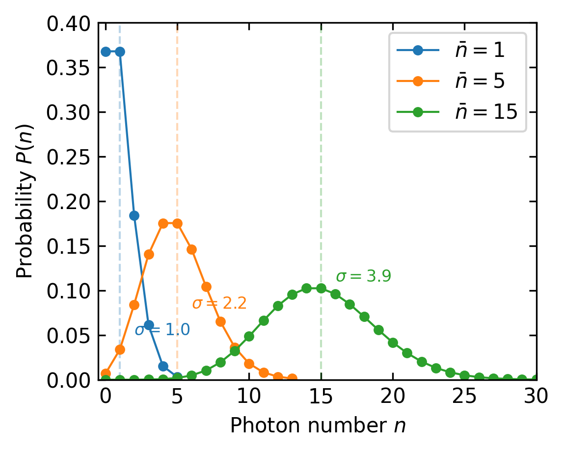Figure 2— Poisson distribution of photon number statistics for three different mean photon numbers. The plot shows the probability \(P(n)\) of detecting exactly \(n\) photons for light with mean photon number \(\bar{n}\). As the mean increases, the distribution broadens with variance equal to the mean, demonstrating the characteristic \(\sqrt{\bar{n}}\) fluctuations of coherent light.