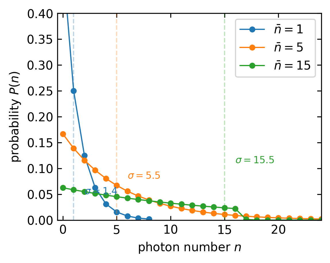 Figure 3— Thermal light distribution of photon number statistics for three different mean photon numbers. The plot shows the probability \(P(n)\) of detecting exactly \(n\) photons for thermal light with mean photon number \(\bar{n}\). Compared to the Poisson distribution, thermal light shows more significant photon bunching, with higher probabilities for both zero photons and large photon numbers, demonstrating the characteristic excess noise proportional to \(\bar{n}^2\).
