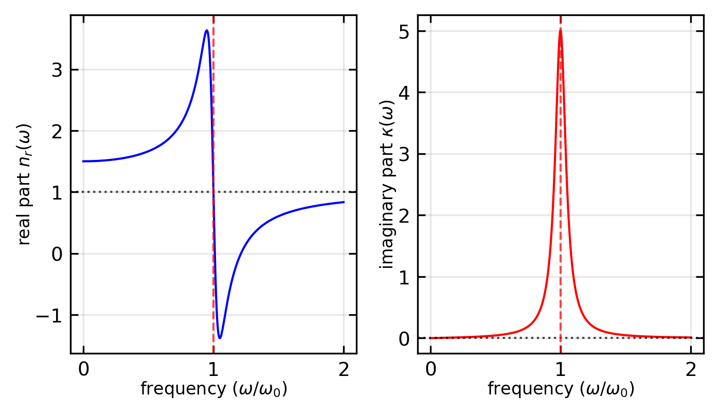 The real part \(n_r(\omega)\) controls the phase velocity and refraction, while the imaginary part \(\kappa(\omega)\) determines absorption according to the Beer-Lambert law: \(I \propto e^{-2\omega\kappa z/c}\). These components can be written as: \[n_r(\omega) = 1 + A\frac{(\omega_0^2-\omega^2)}{(\omega_0^2-\omega^2)^2+\omega^2\sigma^2}\]