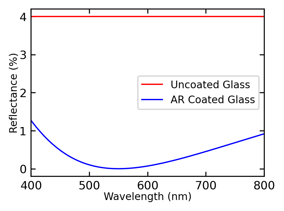 For an air-glass interface (\(n_1 = 1.0\), \(n_2 = 1.5\)), this gives a reflection of about 4% of the incident intensity. This is why untreated glass reflects approximately 4% of light at each air-glass interface, an important consideration in optical systems like cameras and microscopes where multiple optical elements are used. The intensity loss through a thick glass window with two interfaces would be approximately 8%, which can be significant for precision measurements or energy-sensitive applications.
