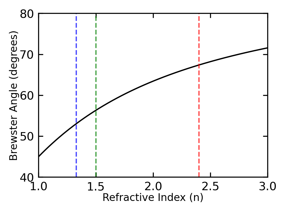 Figure 6— Brewster angle as a function of refractive index for air-medium interfaces. Vertical dashed lines mark specific materials: Water (blue, \(n=1.33\), \(\theta_B=53.1^{°}\)), Glass (green, \(n=1.5\), \(\theta_B=56.3^{°}\)), and Diamond (red, \(n=2.4\), \(\theta_B=67.4^{°}\)).