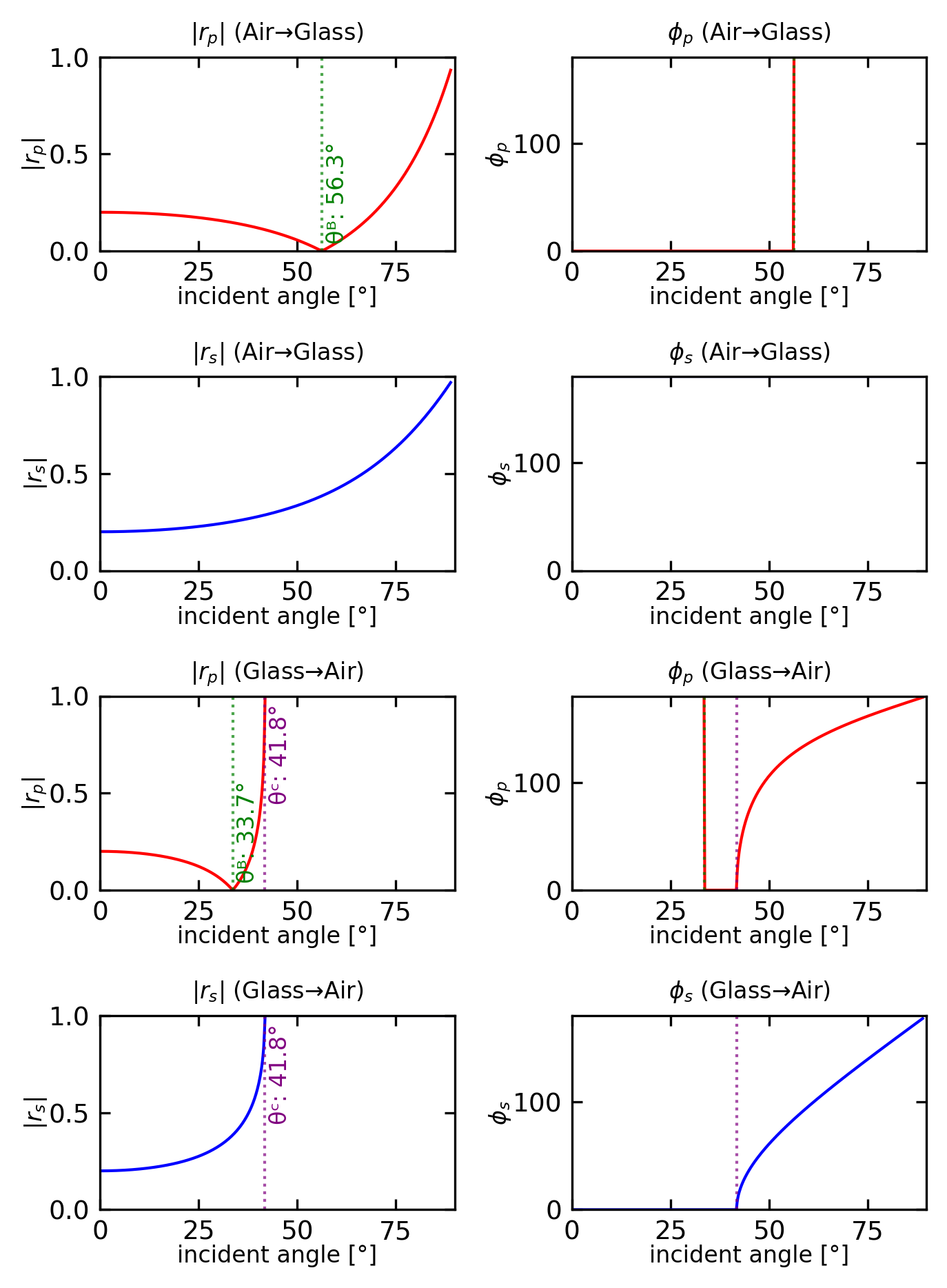Figure 4— Magnitude and phase of Fresnel reflection coefficients for air-glass and glass-air interfaces. θᴮ marks the Brewster angle where r_p=0, and θᶜ marks the critical angle where total internal reflection begins.