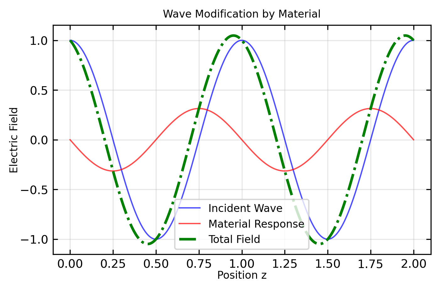 When electromagnetic waves travel through a material, they interact with the bound charges (electrons and nuclei) we discussed earlier in the atomic polarization model. These microscopic interactions manifest as macroscopic modifications to the wave’s properties through a collective response of billions of atomic dipoles. Let’s examine these effects from a fundamental physical perspective.