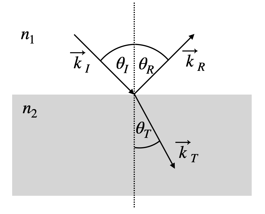 Figure 3— Reflection and refraction at an interface between materials with refractive indices \(n_1\) and \(n_2\).