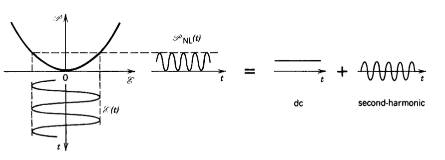 \[\mathbf{P}^{(2)}(t) = \varepsilon_0 \chi^{(2)} \mathbf{E}^2(t) = \varepsilon_0 \chi^{(2)} (\mathbf{E}_\omega e^{-i\omega t} + \mathbf{E}_\omega^* e^{i\omega t})^2\]